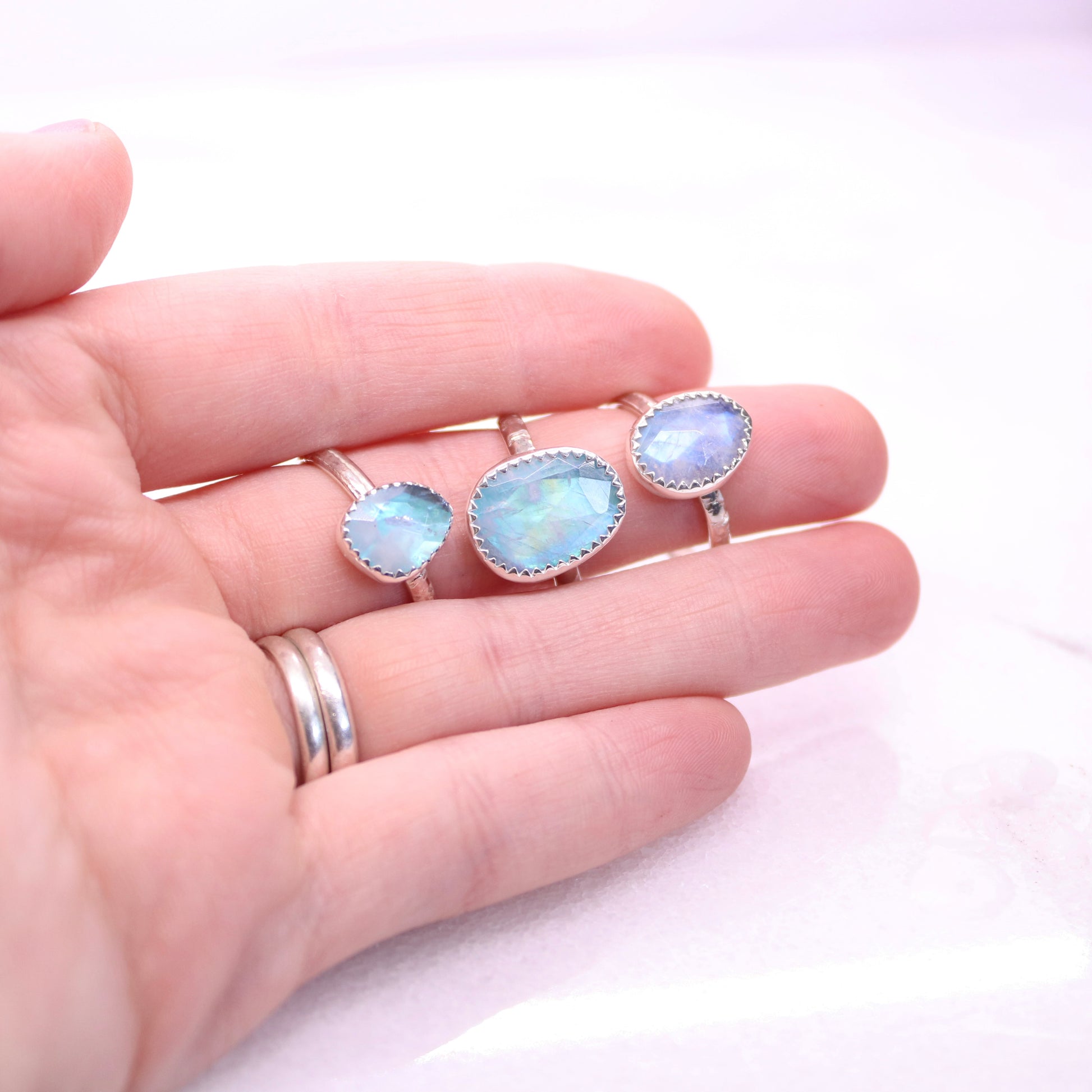 Gorgeous faceted rainbow moonstone set in sterling and fine silver with a textured band. Size 7.
