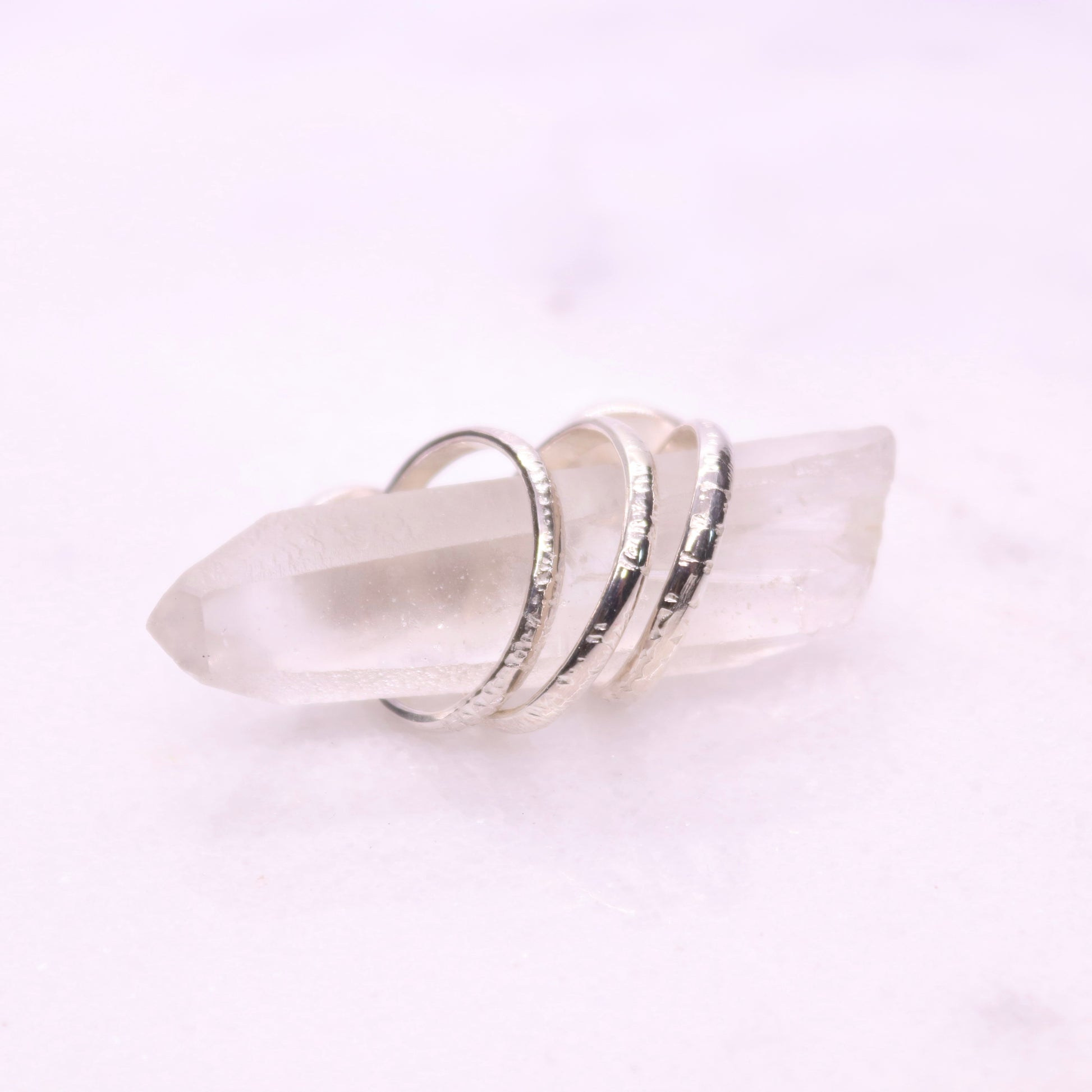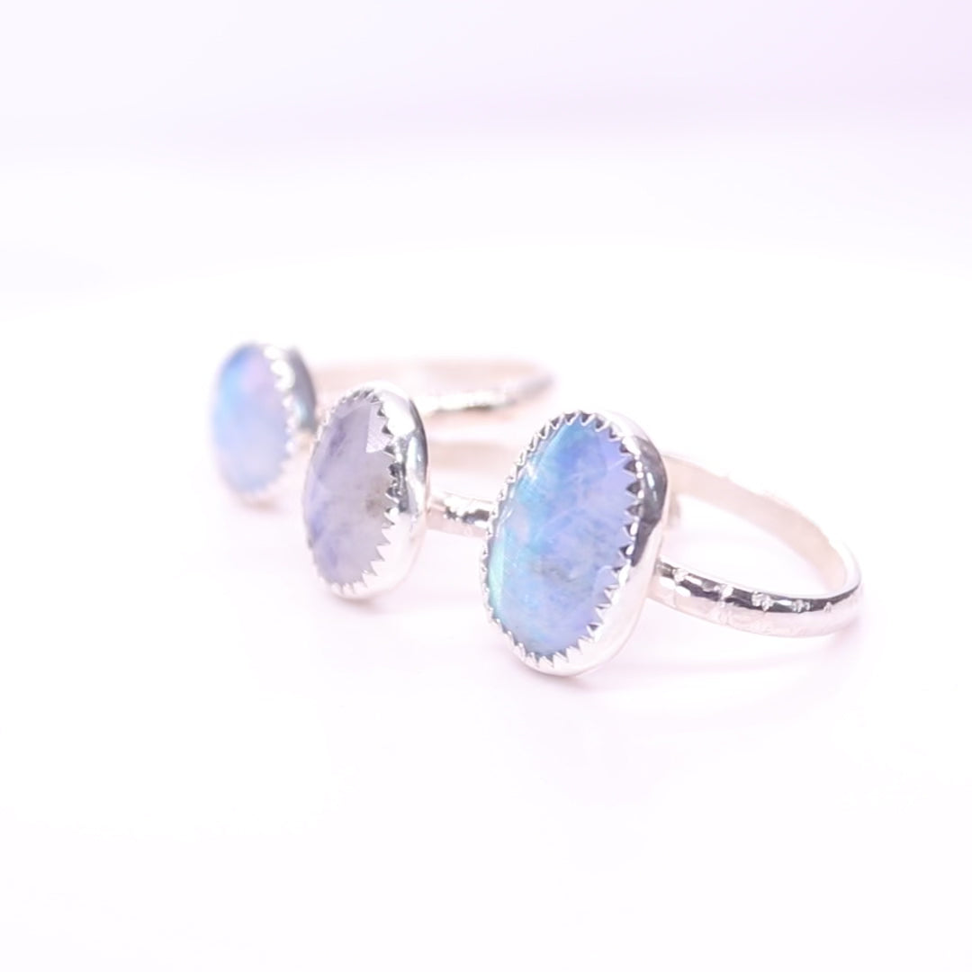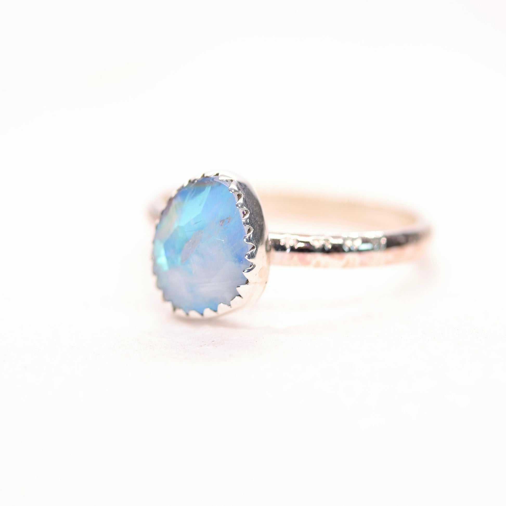 Gorgeous faceted rainbow moonstone set in sterling and fine silver with a textured band. Size 9.