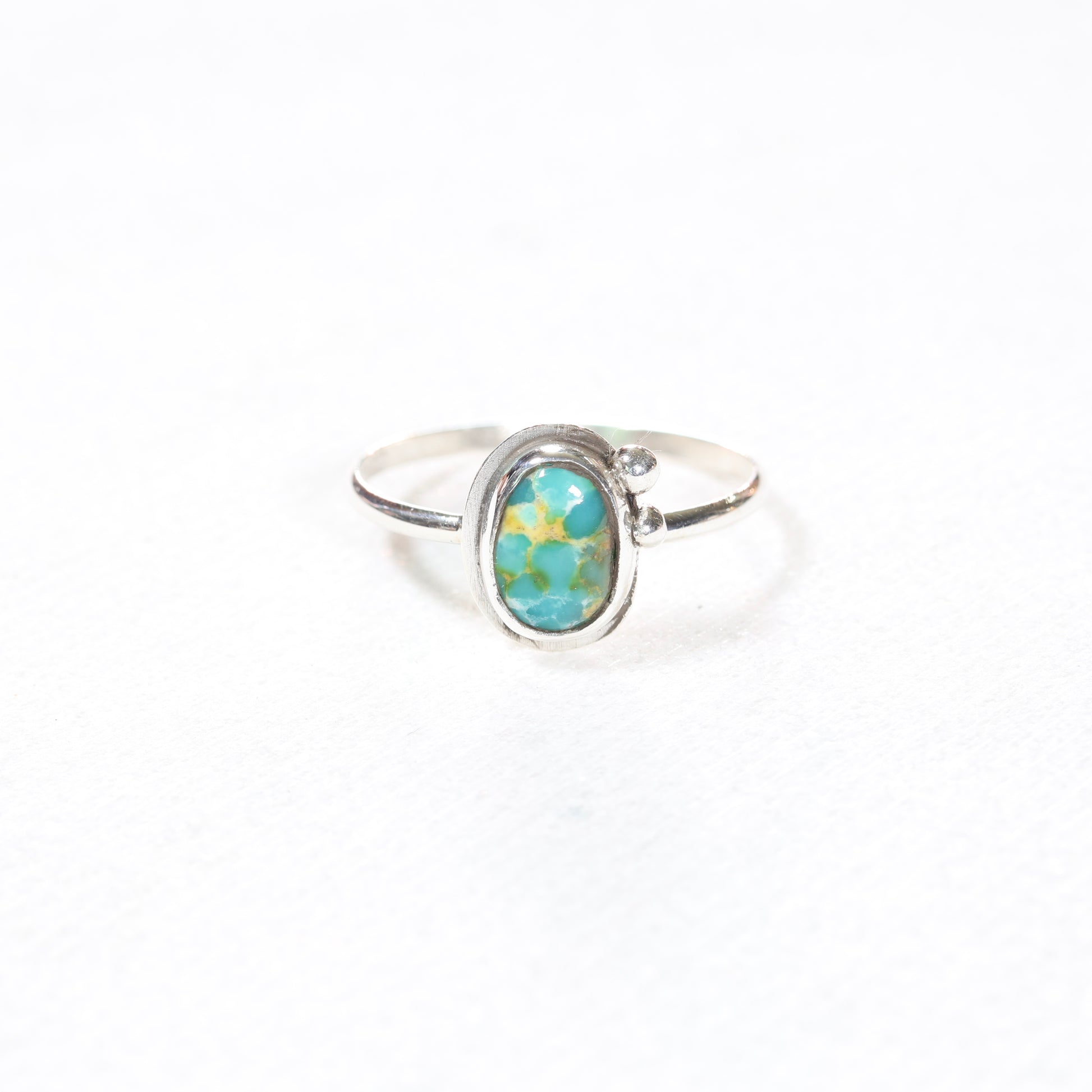 This ring features a Sonoran Gold turquoise stone from Mexico. Sterling and fine silver, beaded details. Size 9 1/2.